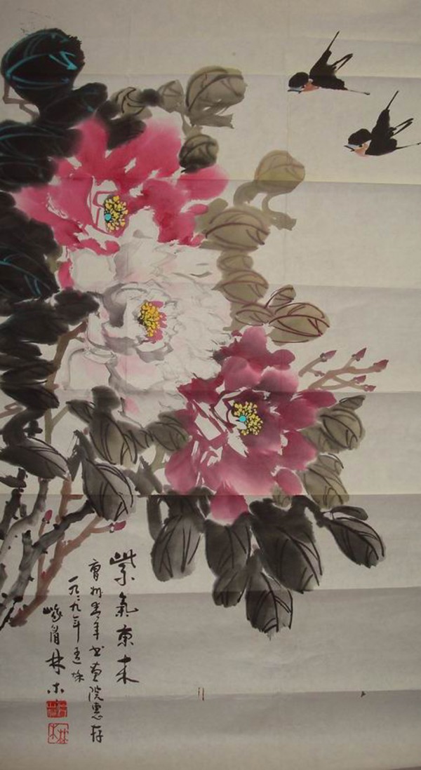 “绘画是我的爱好,它给了我一生的快乐。在我最艰难的时候给了我心灵上的慰藉,让我忘掉了痛苦,看到了希望。”林木爱牡丹,更喜欢画写意牡丹。仔细观之,《林木书画集》中的牡丹千姿百态,艳而不俗,有的用笔随意潇洒,墨色浓淡相宜,淋漓生动;有的构图茂密,色彩浓重,意境深邃;有的造型简洁,用纯墨画叶,着力表现牡丹的“富贵”神韵。不同天气条件下的牡丹在他手下各展神韵,风中牡丹动感十足;雨露中牡丹显得厚重饱满;峨眉山冬放牡丹,枝上有花无叶,显得格外清雅;阳光下的牡丹,巧用环境色、光源色,在高处留白,效果甚佳,恰到好处。多幅牡丹图配以紫燕、蜂、蝶,充满了灵性与动感。画面布局走向起伏,花叶枝干疏密呼应,鸟虫合理搭配,整体主次分明,和谐统一。