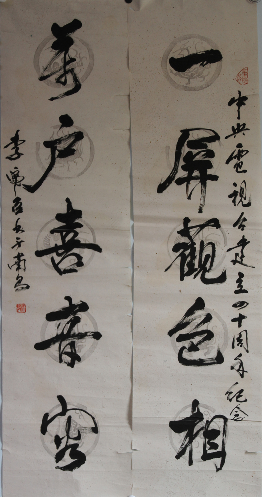 1998年中国电视 业创建四十周年作品展,书法作品《一屏观色相, 》,美术《山水》入选,并在美术馆展出。