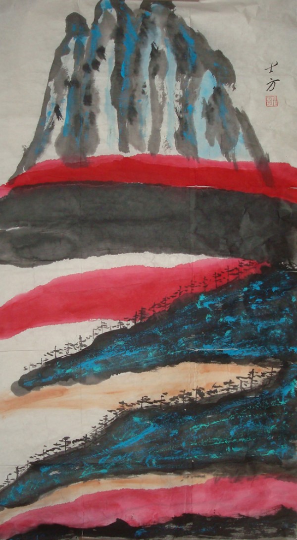 高层次的艺术作品应该具有不可重复的唯一性,无论是艺术家本人,还是他人均不能完全复制、摹仿(件与件之间均有不同)。中国书画中的草书和写意画为产生高层次的艺术作品提供了可能性(但不是任何人的草书和写意画都达到高层次的艺术标准)。水墨的冲撞和颜色的渲染,在生宣纸上留下的痕迹是那么奇幻无比,气象万千。高层次的艺术作品还有一个特质,就是它的即兴性,或曰灵感迸发性。它应该是长期积累,偶然得之,厚积薄发,挥洒自如;而不是刻意地程式化、工艺化的制作。我的创作寻求的就是这样一种高层次的艺术作品。不知现在达到了几分?那是要由大家去评判的。